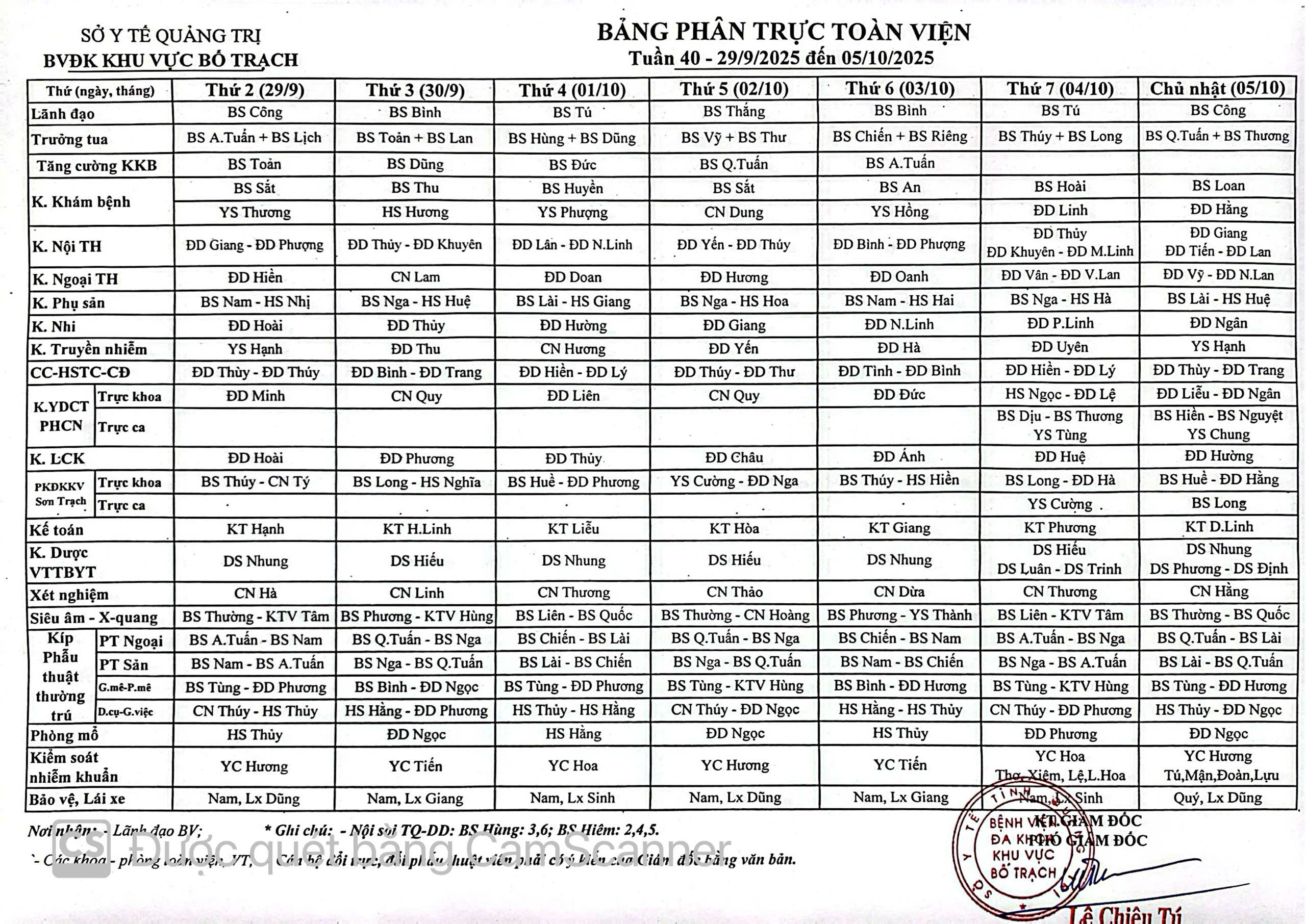 LỊCH TRỰC TUẦN 39(TỪ 22/09/2025 ĐẾN 28/09/2025) 9/27/2025 9:32:03 AM